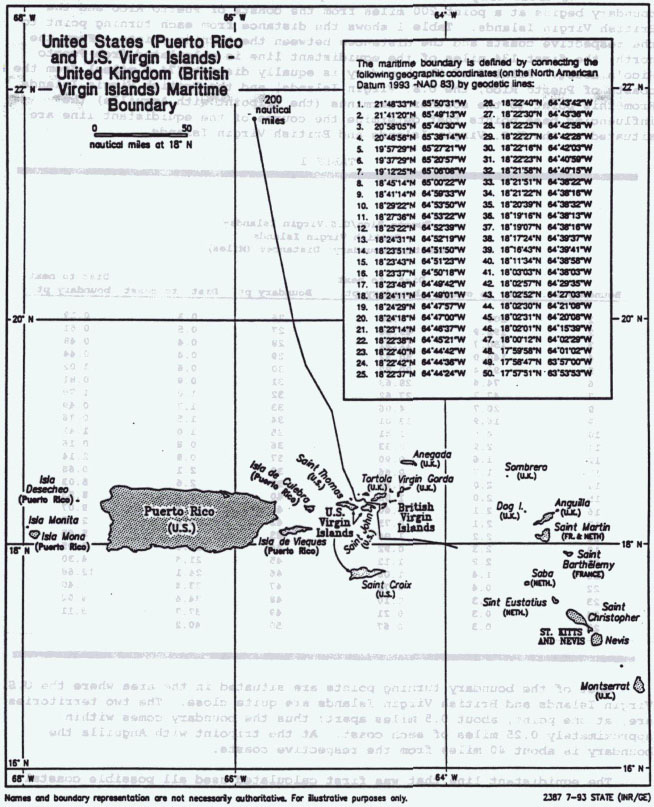 Download: As GML (Geographic MarkUp Language) Boundaries established in treatiesAnguilla (Show line) (Download coordinates as GML)Digital Documents: Treaty between the Government of the United Kingdom of Great Britain and Northern Ireland and the Government of the United States of America on the delimitation in the Caribbean of a maritime boundary between the US Virgin Islands and Anguilla, 5 Nove... (Download) (Download) British Virgin Islands (Show line) (Download coordinates as GML) Digital Documents: Treaty on the delimitation in the Caribbean of a maritime boundary relating to Puerto Rico/U.S. Virgin Islands and the British Virgin Islands, 5 November 1993 (Download) United States (Puerto Rico and US Virgin Islands) - United Kingdom (British Virgin Islands) Maritime Boundary (Download) Venezuela (Show line) (Download coordinates as GML) Digital Documents: Maritime Boundary Treaty between the United States of America and the Republic of Venezuela 28 March 1978 (Download) Maritime Boundary: Venezuela - USA (Download) Boundaries calculated as median lineSaba (Show line) (Download coordinates as GML)Digital Documents: VLIZ Median Line (View) Puerto Rico (Show line) (Download coordinates as GML) Digital Documents: VLIZ Median Line (View) | |||||