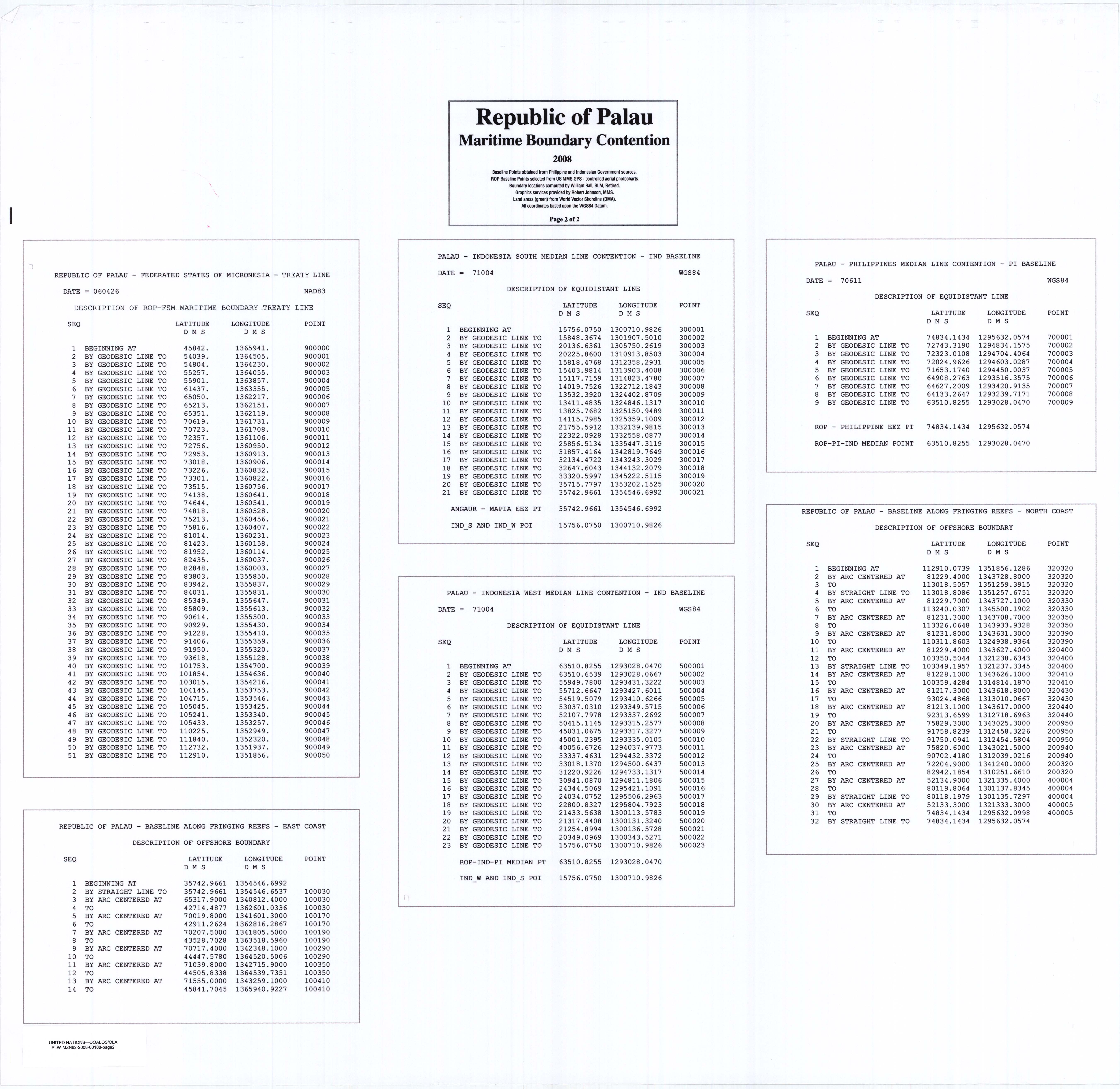 Download: As GML (Geographic MarkUp Language) Boundaries established in treatiesMicronesia (Show line) (Download coordinates as GML)Digital Documents: Treaty between the Federated States of Micronesia and the Republic of Palau concerning Maritime Boundaries and Cooperation on Related Matters (Download) Boundaries calculated as median linePhilippines (Show line) (Download coordinates as GML)Digital Documents: VLIZ Median Line (View) Indonesia (Show line) (Download coordinates as GML) Digital Documents: VLIZ Median Line (View) 200NM boundariesPalau (Show line) (Download coordinates as GML)Digital Documents: Republic of Palau – Maritime Boundary Contention (Download) Palau (Show line) (Download coordinates as GML) Digital Documents: Republic of Palau – Maritime Boundary Contention (Download) | |||||
