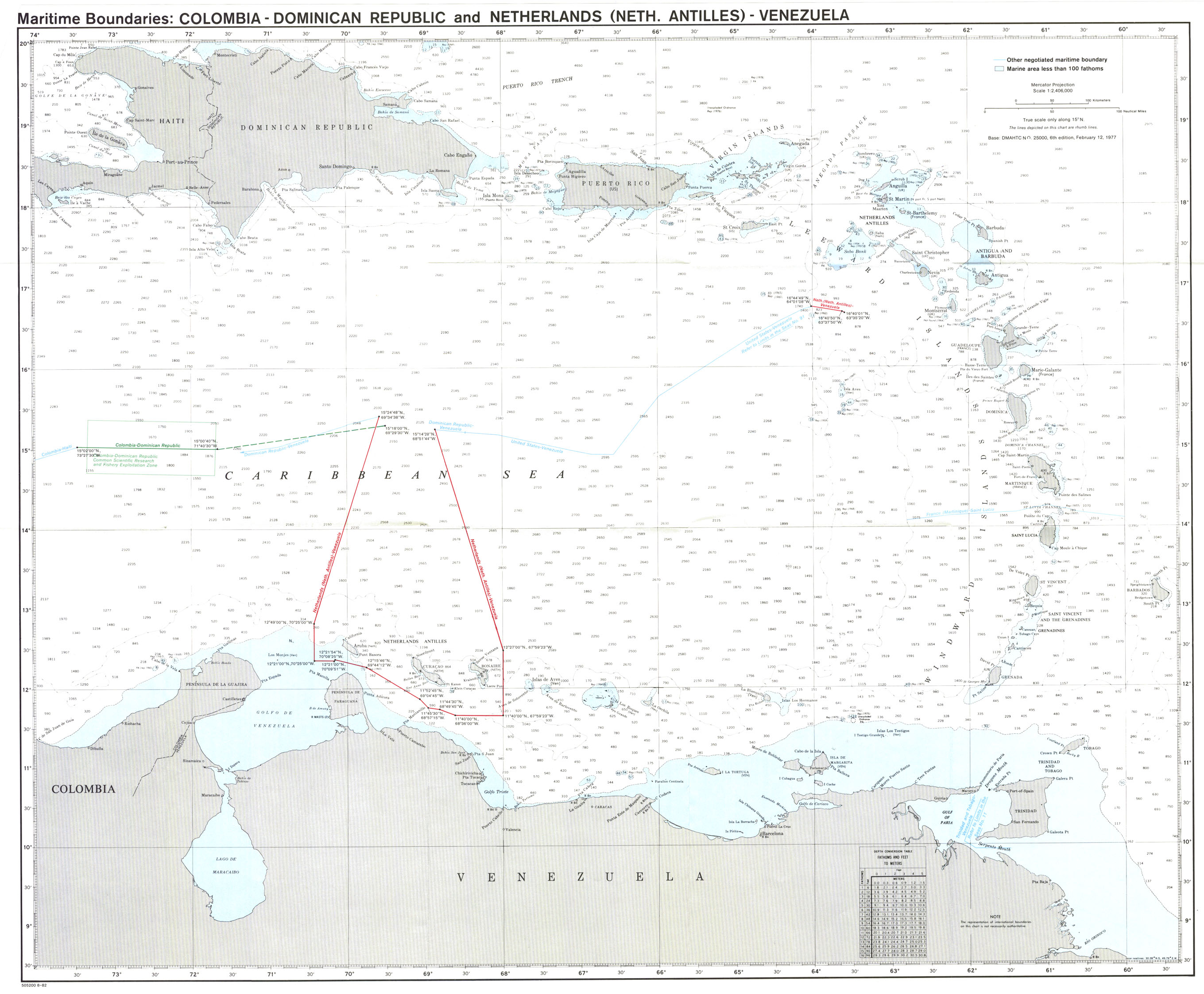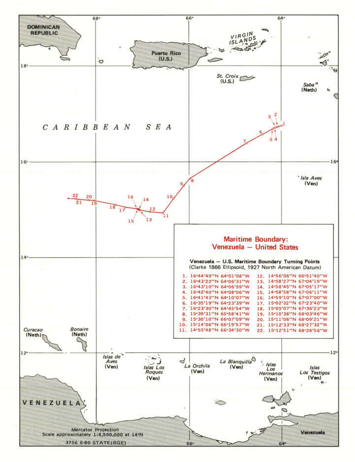 Download: As GML (Geographic MarkUp Language) Boundaries established in treatiesAruba (Show line) (Download coordinates as GML)Digital Documents: Boundary Delimitation Treaty between the Republic of Venezuela and the Kingdom of the Netherlands 31 March 1978 (Download) Maritime Boundaries: Colombia - Dominican Republic and Netherlands - Venezuela (Download) Bonaire (Show line) (Download coordinates as GML) Digital Documents: Boundary Delimitation Treaty between the Republic of Venezuela and the Kingdom of the Netherlands 31 March 1978 (Download) Maritime Boundaries: Colombia - Dominican Republic and Netherlands - Venezuela (Download) CuraƧao (Show line) (Download coordinates as GML) Digital Documents: Boundary Delimitation Treaty between the Republic of Venezuela and the Kingdom of the Netherlands 31 March 1978 (Download) Maritime Boundaries: Colombia - Dominican Republic and Netherlands - Venezuela (Download) Dominican Republic Digital Documents: Maritime Boundary Agreements (1970 - 1984) (Download) Treaty on the Delimitation of Marine and Submarine Areas between the Republic of Venezuela and the Dominican Republic 3 March 1979 (Download) Guadeloupe (Show line) (Download coordinates as GML) Digital Documents: Maritime Boundary Agreements (1970 - 1984) (Download) Delimitation Treaty between the Government of the French Republic and the Government of the Republic of Venezuela 17 July 1980 (Download) Martinique (Show line) (Download coordinates as GML) Digital Documents: Maritime Boundary Agreements (1970 - 1984) (Download) Delimitation Treaty between the Government of the French Republic and the Government of the Republic of Venezuela 17 July 1980 (Download) Puerto Rico (Show line) (Download coordinates as GML) Digital Documents: Maritime Boundary Treaty between the United States of America and the Republic of Venezuela 28 March 1978 (Download) Maritime Boundary: Venezuela - USA (Download) Saba (Show line) (Download coordinates as GML) Digital Documents: Boundary Delimitation Treaty between the Republic of Venezuela and the Kingdom of the Netherlands 31 March 1978 (Download) Maritime Boundaries: Colombia - Dominican Republic and Netherlands - Venezuela (Download) Trinidad and Tobago (Show line) (Download coordinates as GML) Digital Documents: Treaty between the Republic of Trinidad and Tobago and the Republic of Venezuela on the delimitation of marine and submarine areas, 18 April 1990 (Download) Continental Shelf Boundary: Trinidad and Tobago - Venezuela (Download) United States Virgin Islands (Show line) (Download coordinates as GML) Digital Documents: Maritime Boundary Treaty between the United States of America and the Republic of Venezuela 28 March 1978 (Download) Maritime Boundary: Venezuela - USA (Download) Boundaries calculated as median lineGrenada (Show line) (Download coordinates as GML)Digital Documents: VLIZ Median Line (View) Saint Vincent and the Grenadines (Show line) (Download coordinates as GML) Digital Documents: VLIZ Median Line (View) Saint Lucia (Show line) (Download coordinates as GML) Digital Documents: VLIZ Median Line (View) Saint Kitts and Nevis (Show line) (Download coordinates as GML) Digital Documents: VLIZ Median Line (View) Colombia (Show line) (Download coordinates as GML) Digital Documents: VLIZ Median Line (View) | |||||